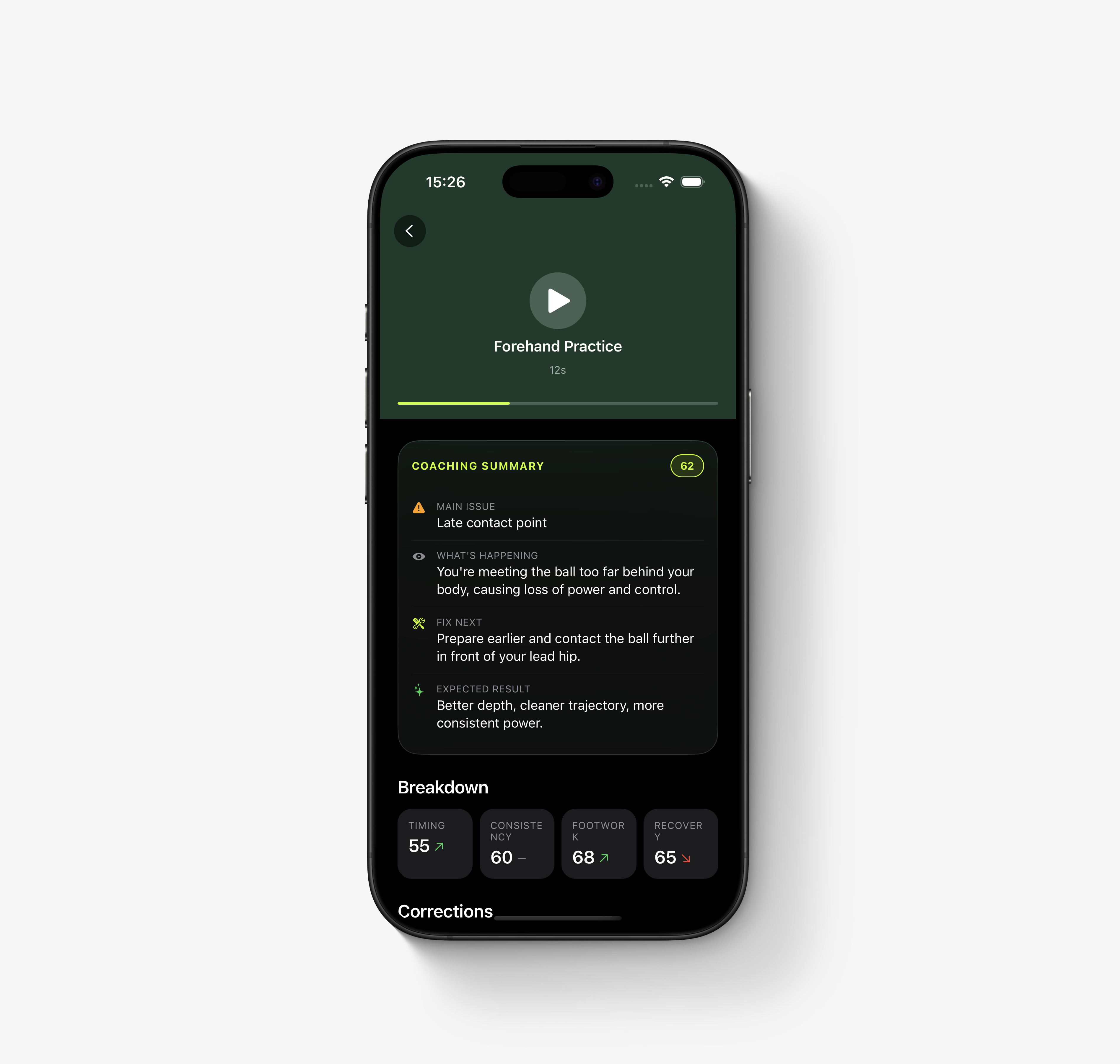Record or upload a clip, and the app overlays corrections directly on your video.